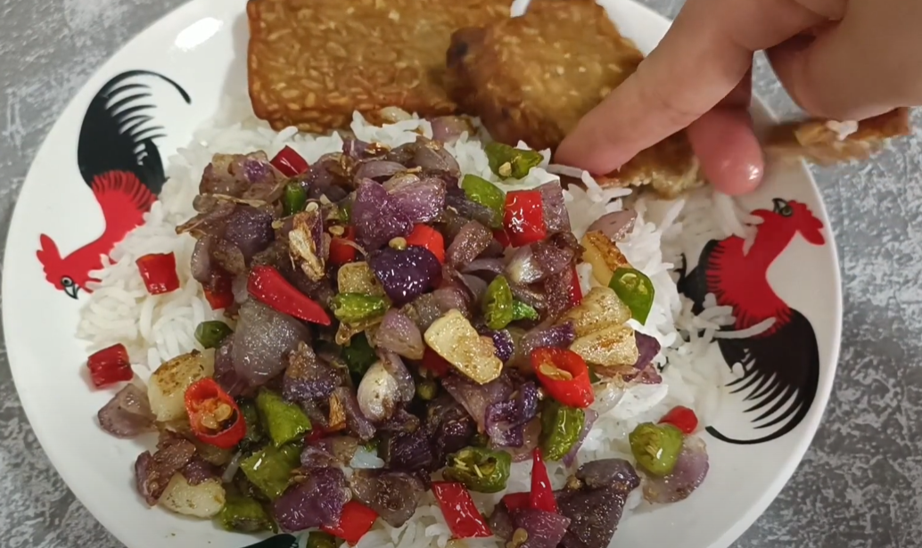 Jika sudah dirasa matang, tuang tumisan cabe bawang di atas nasi yang sudah siap disajikan dan disantap dengan lauk tempe goreng.