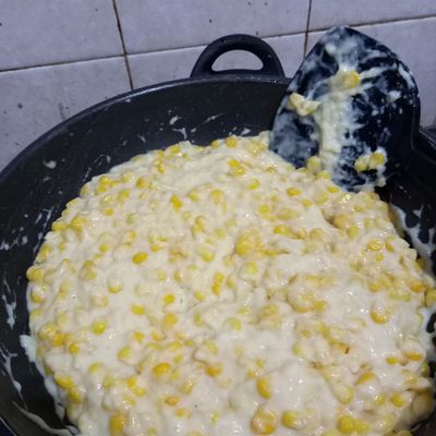 Masak dan aduk hingga jagung sudah matang dan sudah tercampur rata.