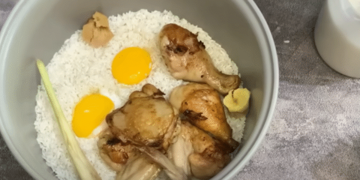 Masukkan 2 butir telur ke dalam beras yang di wadah rice cooker, masukkan ayam yang tadi sudah digoreng, lalu masukkan semua bahan – bahan dan tuang santannya. Jangan lupa masukkan bawang yang sudah kita tumis tadi.