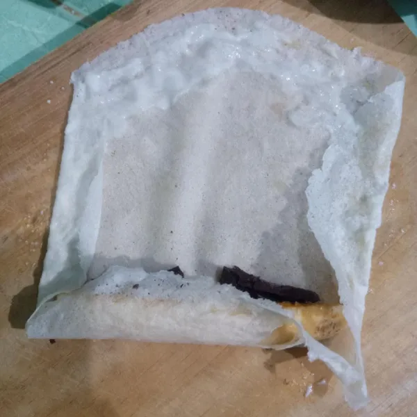 4. Ambil kulit lumpia per lembar, letakkan potongan pisang.