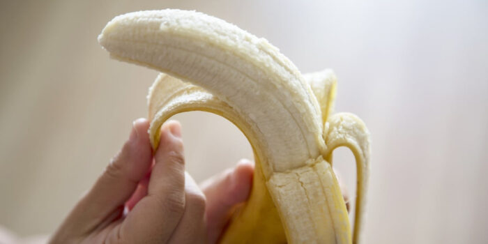1. Kupas kulit pisang dan potong pisang menjadi dua bagian memanjang.