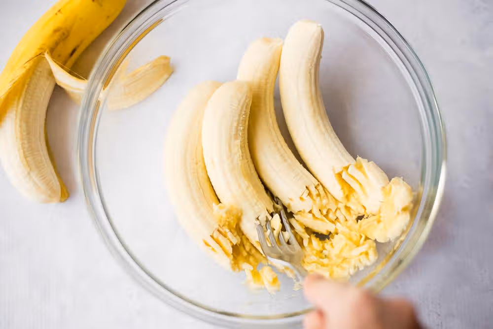 Pertama kita lumatkan pisang menggunakan garpu hingga halus.