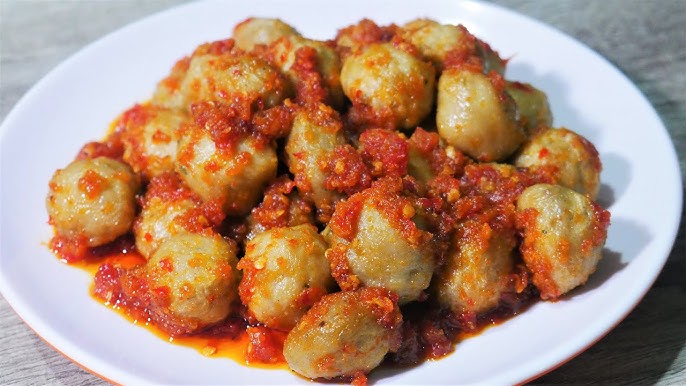 - Tumis sambal hingga harum, lalu masukkan pentol yang sudah dibulatkan.